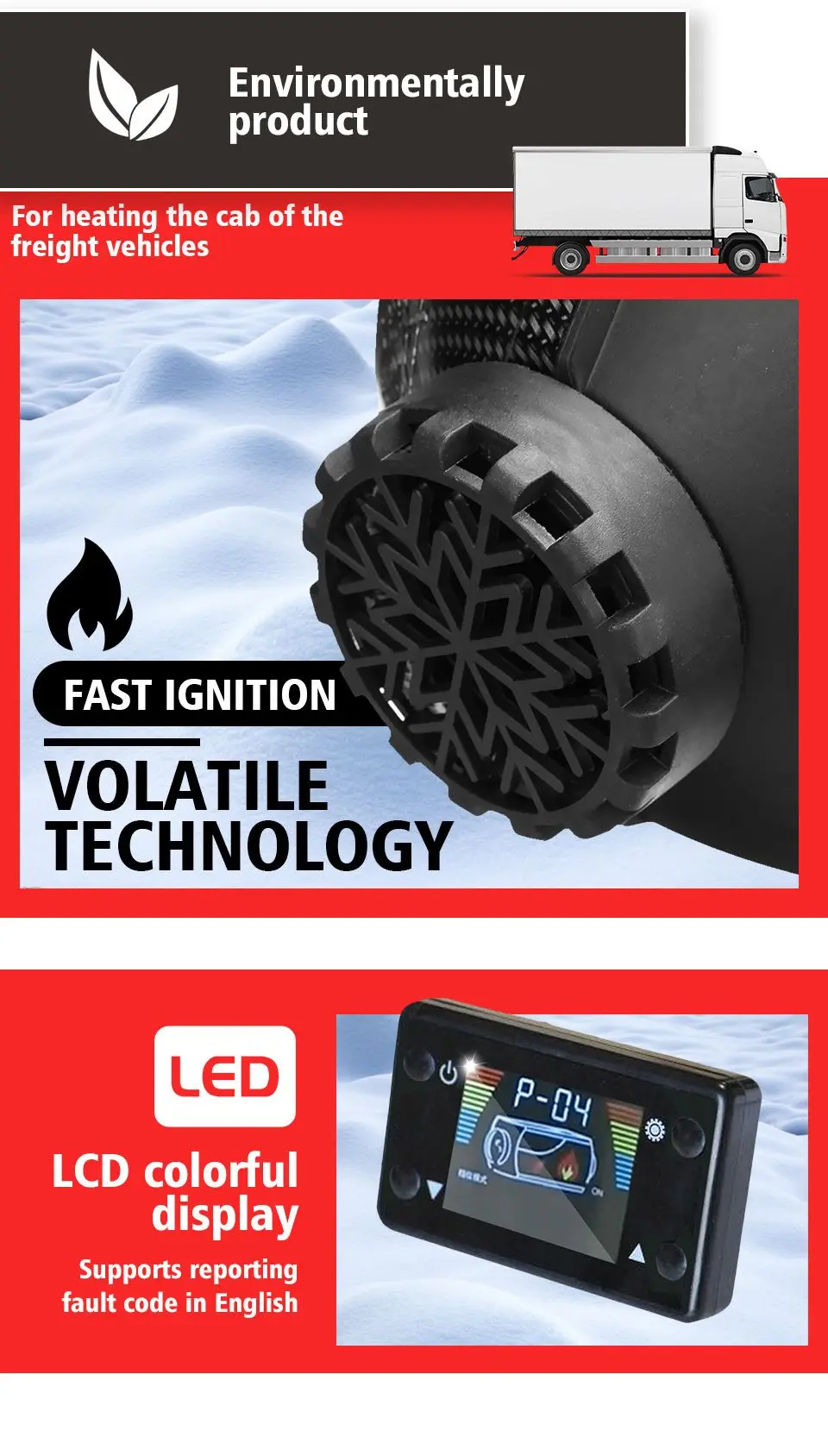 ●Environmentally product, low emissions, low fuel consumption; heater exhaust emissions to meet euro IV engine emissions requirements.