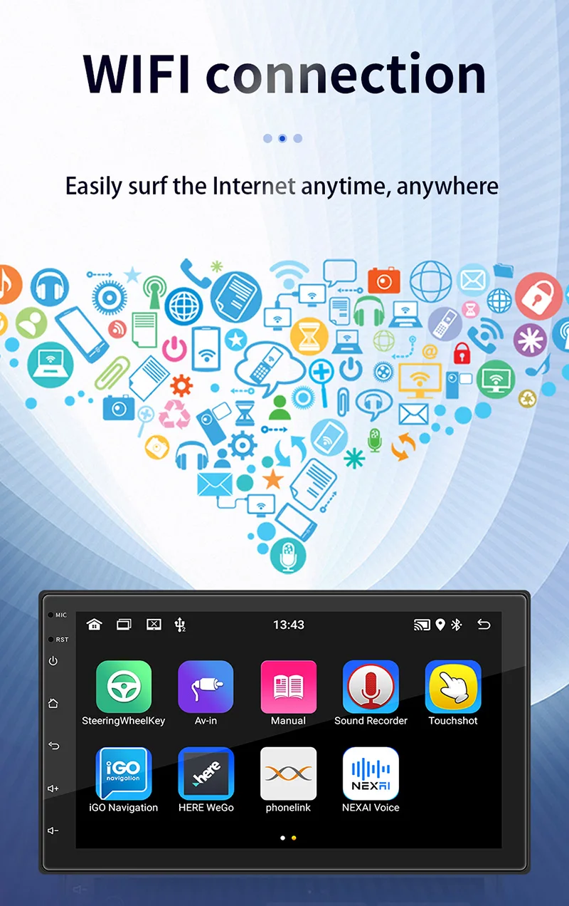 Real-time traffic conditions, support manual search and automatic search, master current affairs, news and traffic information, 18 radio stations can be pre-stored FM1/FM2/FM3, three-band high-quality radio