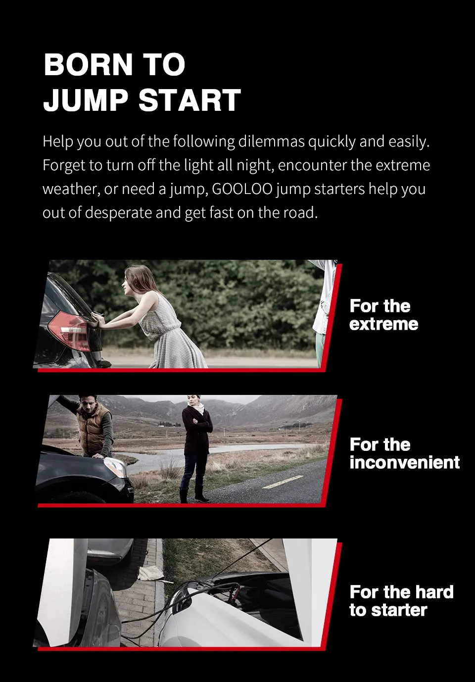 Help you out of the following dilemmas quickly and easily. Forget to turn off the light all night, encounter the extreme weather, or need a jump, GOOLOO jump starters help you out of desperate and get fast on the road.