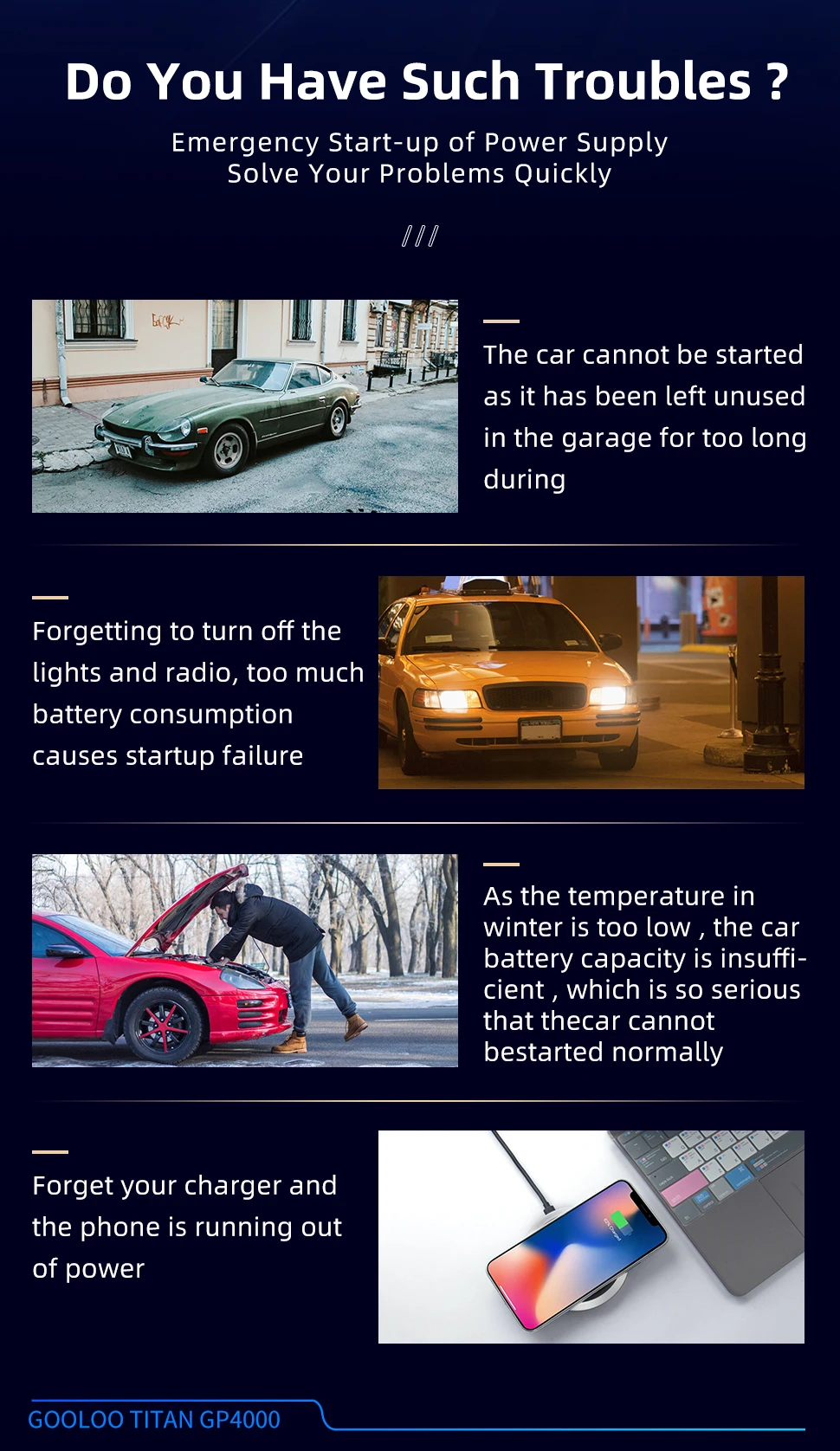 The GP4000 portable car battery jump starter is equipped with dual USB charge ports (one is quick charge compatible).Supports USB type-C charging (5V/3A); you can use it to charge your other devices or charge the jump starter itself.