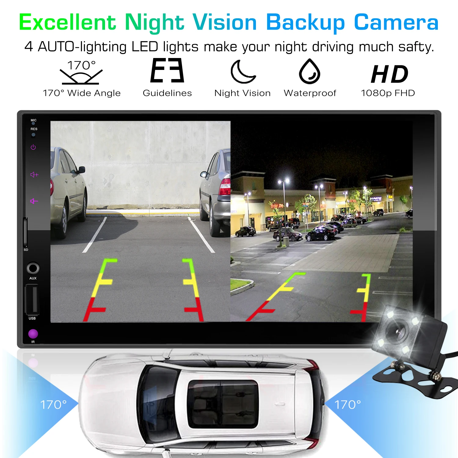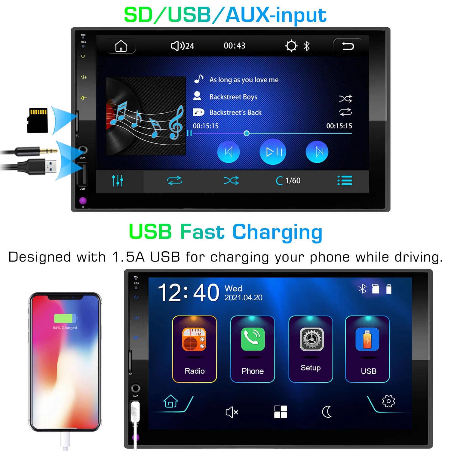 Checkout this double-din 7023, is touchscreen ,bluetooth Apple CarPlay ,with multi-color illumination and usb ,sd , av ,rear camera ,and steering wheel control inputs . it also features front , rear & surwoofer .amp outputs